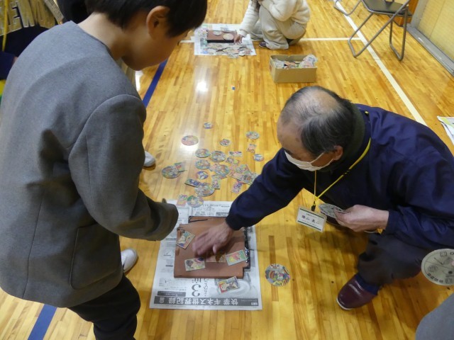 こま・けん玉コーナーではひもの巻き方や膝の使い方のコツを教わり、真剣な表情で挑戦していました。あやとり・お手玉コーナーではボランティアの方の手元をじっと見つめ、「できた!」と鮮やかな技を披露する姿も見られました。かるた・めんこコーナーでは狙いを定めて力いっぱい叩きつけたり、素早く札を取ったりと、体育館中に元気な声が響き渡りました。