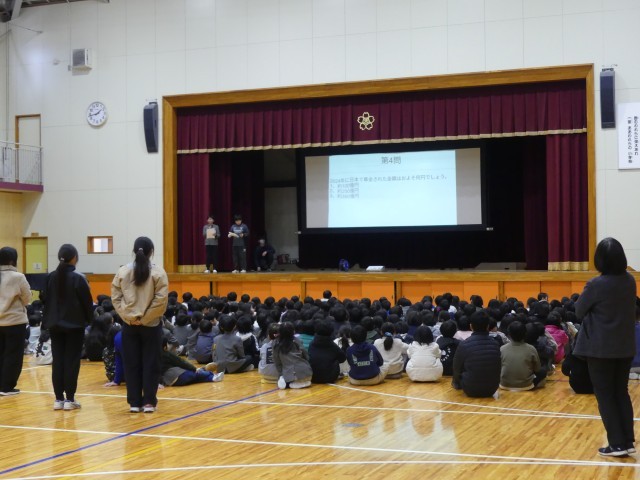 運営委員会が主体となって企画・運営した「ユニセフ集会」が行われました。全校児童が体育館に集まり、まずは運営委員会のメンバーによる劇からスタート。自分たちで準備したスライドを使いながら、ユニセフがどのような活動をしているのか、世界にはどのような環境で過ごしている子どもたちがいるのかを分かりやすく伝えました。日本の当たり前な生活と、世界の現状を比較する劇を行い、視覚的に分かりやすく伝えました。日本の当たり前な生活と、世界の現状を比較する劇を行い、視覚的に分かりやすく伝えました。また、ユニセフや募金に関するクイズを出題!「2024年に日本で募金された金額は?」といった問いに、みんな驚きの声を上げながら参加していました。