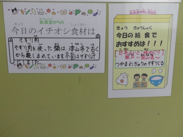 日本よいところ味めぐり献立は今月で第49弾にもなりました。ついに日本一周達成だそうです。最後の月は岡山県。今日のメニューはごはん、牛乳、鰆の西京焼き、浅漬け、つやま和牛入りそずり汁、津山産ピオーネゼリーです。鰆は岡山県の県魚です。鰆は岡山県の県魚にも指定されていて、昔からよく食べられています。そずり肉を使った鍋は古くから津山市で親しまれています。ピオーネは岡山県が生産量全国一位です。自分たちの市や県の食材がたっぷり使われたメニューです。