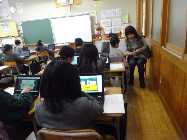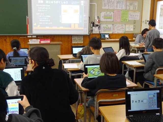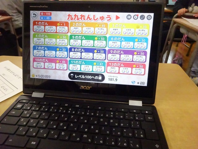 2年生の算数では、現在「九九」の習熟に全力で取り組んでいます。本日は「主体的な学びの基盤づくり事業」の一環として、4名の学習支援員の皆様が来校されました。子どもたちはタブレット端末の練習ソフトを活用し、自分のペースで繰り返し問題に挑戦。正解して「レベル100への道」が進むと、嬉しそうに画面を見せてくれました。