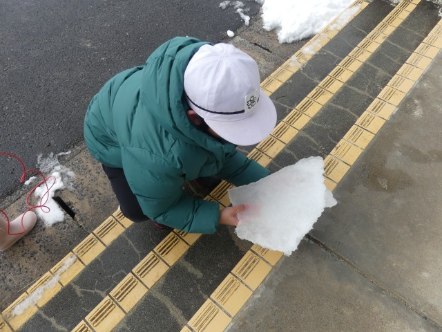 友だちや先生と雪玉を投げ合い、追いかけっこを楽しむ元気な声が響いていました。小さな雪玉を丁寧に転がして大きな塊にしたり、雪を高く積み上げたりと、協力して大作に挑戦する姿もありました。足元に張った薄い氷を見つけ、「見て!こんなに大きいよ!」と大切そうに抱えて見せてくれる子もいました。