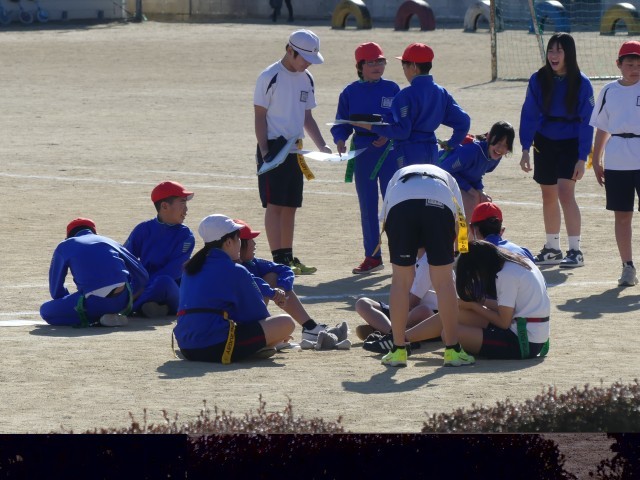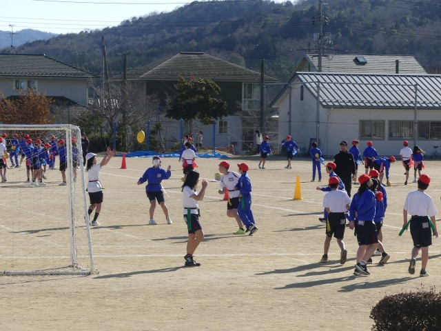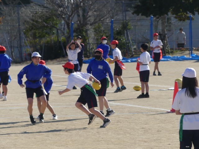 この競技は、タックルの代わりに腰につけた「フラッグ」を取るスポーツで、接触が少なく誰もが安全に楽しめるのが特徴です。本日の授業では、各チームが作戦ボードやプリントを囲み、「どうすれば相手の守備を突破できるか」を真剣に話し合っていました。「右から走るふりをして、左にパスを出そう!」「守りはこの位置に立とう」など、具体的なアイディアが次々と飛び出していました。実際の試合では、作戦通りにパスがつながると大きな歓声が上がっていました。運動量だけでなく、チームの「思考力」と「絆」が試されるフラッグフットボール。卒業を控えた6年生らしく、互いに声を掛け合いながら、熱いプレーを見せてくれました。
