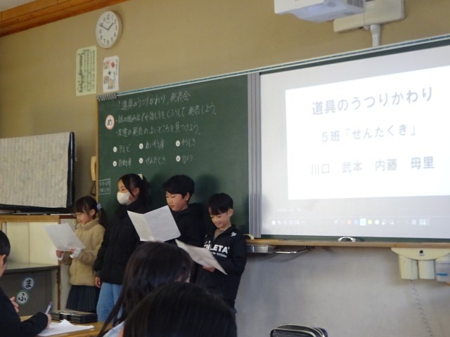 社会科の学習で取り組んできた「道具のうつりかわり」について、グループごとに調べた成果を発表しました。今回のミッションは、昔の道具がどのように変化し、今の便利な暮らしにつながっているのかを分かりやすく伝えること。プレゼンテーション資料を提示し、発表しました。「せんたくき」チーム: 手洗いの苦労から、全自動になるまでの進化を解説。「すいはんき」チーム: 昔の釜と今の炊飯器を写真で比較しながら、おいしく炊くための工夫を紹介。「テレビ・カメラ」などのチーム: 道具の形の変化や驚きの機能についてクイズを交えて発表。