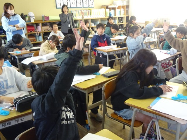 多くの教員が見守る中、子どもたちは緊張を感じさせないほど集中し、課題に対して「じっくり、深く」向き合う姿を見せてくれました。授業の始まりから、子どもたちの目は真剣そのもの。提示された問題に対して、これまでに学んだ知識を使いながら、自分なりの解決方法を見つけようと、ノートに一生懸命書き込んでいました。指導教諭の問いかけに、自信を持って手を挙げる姿や、最後まで粘り強く考え抜く姿からは、算数の楽しさや学ぶ喜びを感じていることが伝わってきました。
