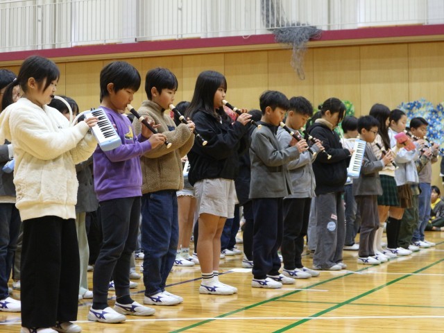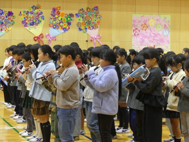 3年生:美しい音色と歌声で贈る「パフ」のメッセージ。3年生は、リコーダーと鍵盤ハーモニカで「パフ」を合奏しました。重なり合う音色が体育館に響き渡り、6年生も静かに聴き入っていました。「パフ」のメロディーに乗せた替え歌でメッセージを伝えました。3年生らしい、心のこもった素敵な発表となりました。