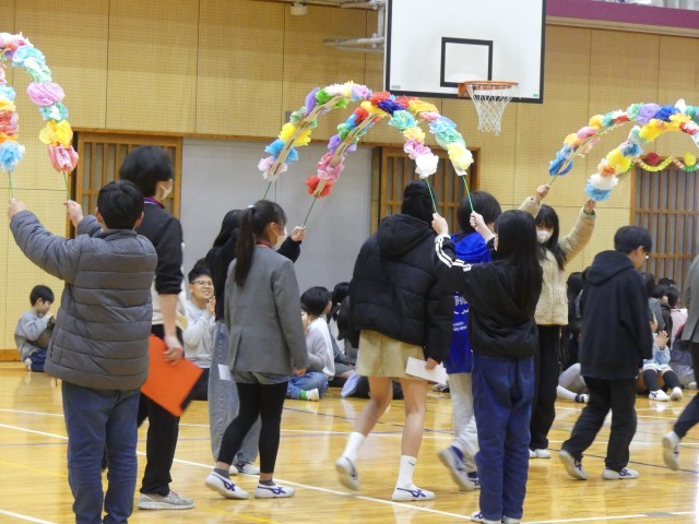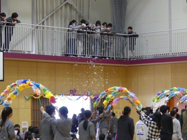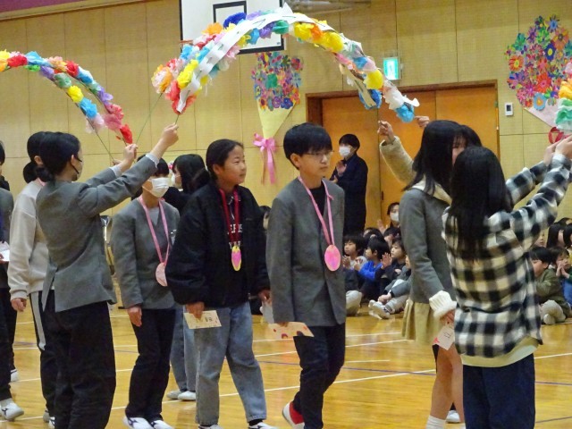 会が終わり、再び花のアーチが掲げられる中、6年生が退場します。