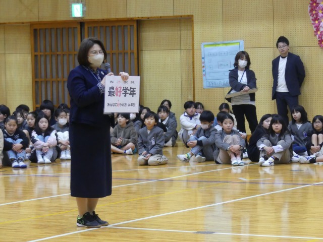 「以前、みんなに『最好学年(さいこうがくねん)』を目指してほしいと話しました。でも、今の6年生はそれだけではありません。周りの人を笑顔にし、幸せにする『最幸学年(さいこうがくねん)』になってくれました」というお言葉をいただき、6年生は誇らしげな表情を浮かべていました。