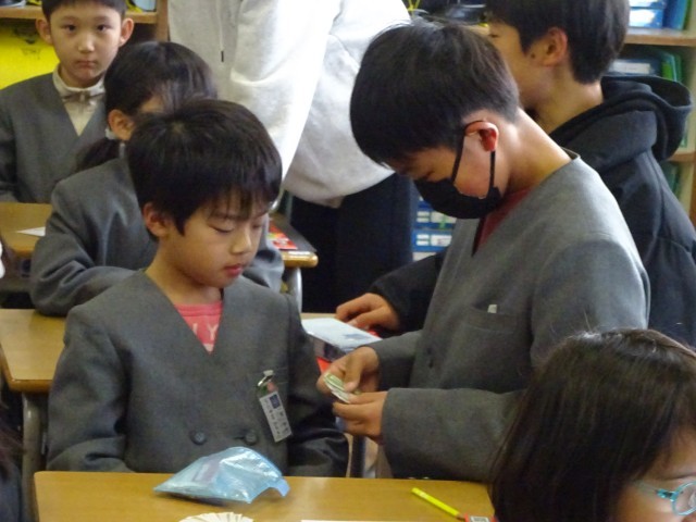 6年生は1年生の隣にそっと寄り添い、たし算・ひき算カードをサポートしました。
