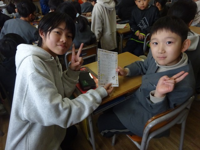 カードをめくるスピードを合わせてあげたり、答えに迷っている子には優しくヒントを出したりする姿は、まさに立派な「先生」そのものでした。1年生が正解すると、6年生は「すごい!正解!」「速くなったね!」と自分のことのように大喜び。