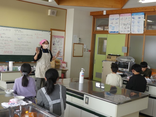 エプロンと三角巾をビシッと身に着け、準備は万端!先生の説明を真剣な表情で聞く姿からは、「おいしいものを作るぞ!」という熱意が伝わってきました。