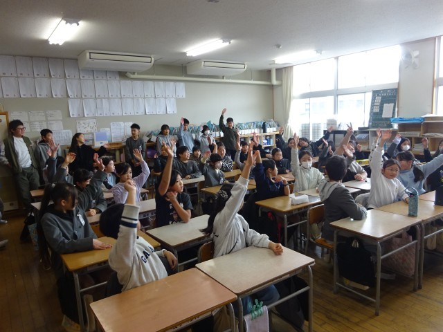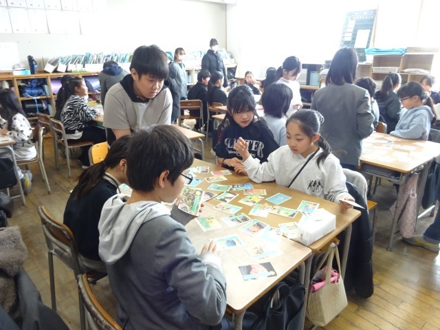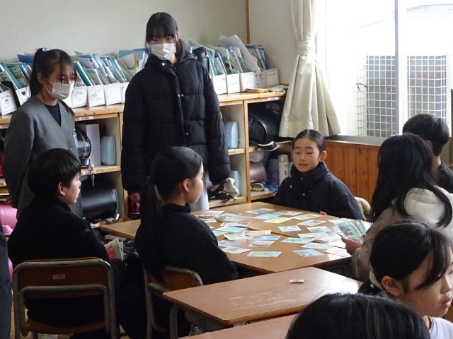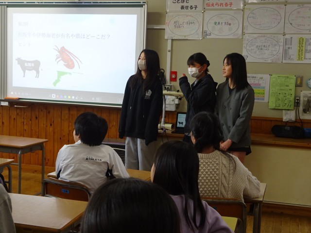 教室の大型モニターを使い、6年生が作成したオリジナルの都道府県クイズを出題しました。「松阪牛や伊勢海老が有名な県はどこ?」といった特産品をヒントにした問題に、4年生は元気よく手を挙げて回答。楽しみながら知識を深める姿が見られました。また、グループに分かれて「都道府県カード」を使った活動もしました。素早くカードを取り合ったり、特徴をヒントに場所を当てたりと、6年生が優しく、時にはお兄さん・お姉さんとしてリードしながら、4年生の学びをサポートしました。
