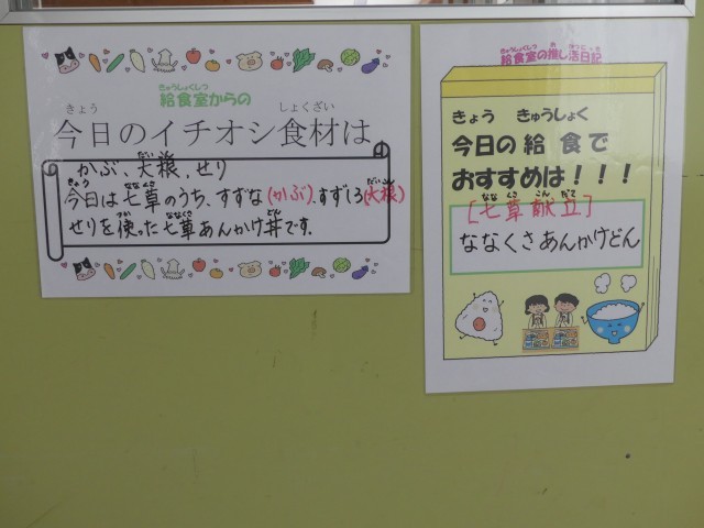 1月7日の「人日の節句」にちなみ、今日の給食は「七草献立」でした。本日のメニューは、七草あんかけどん、牛乳、たくさんあえでした。給食室前の掲示板では、今日の「イチオシ食材」として、春の七草の中から...