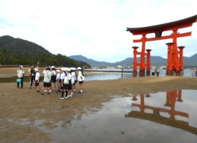 2日目は、厳島神社を参拝しました。ホテルを出発すると、ガイドさんの案内で大鳥居まで行きました。ひいていた潮がだんだんの満ちてきていて、わたしたちが着くころは、大鳥居の下までぎりぎり行くことができました。
