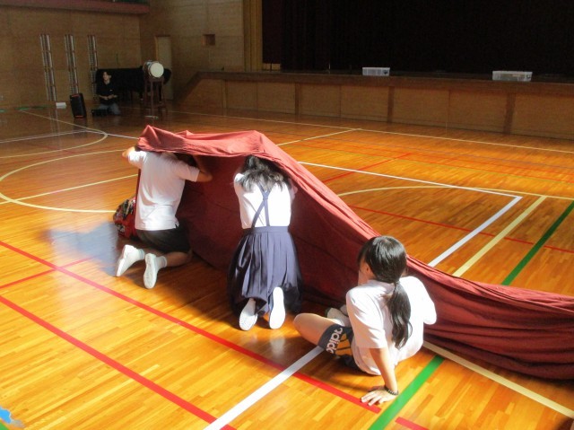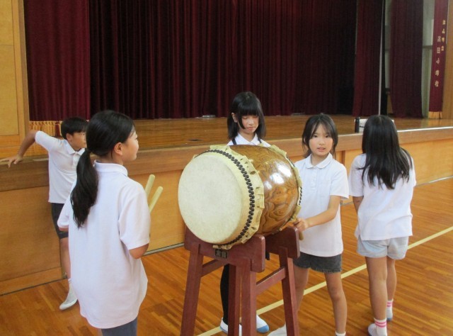 4年生が体育館に集まり、5年生に来てもらって、太鼓のたたき方、笛の吹き方を教えてもらいました。