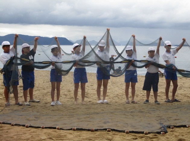 参加校みんなで、力を合わせて網を引きました。力強く引かないと、網から魚がどんどん逃げてしまいます。みんなで声をそろえて網を引くことができました。