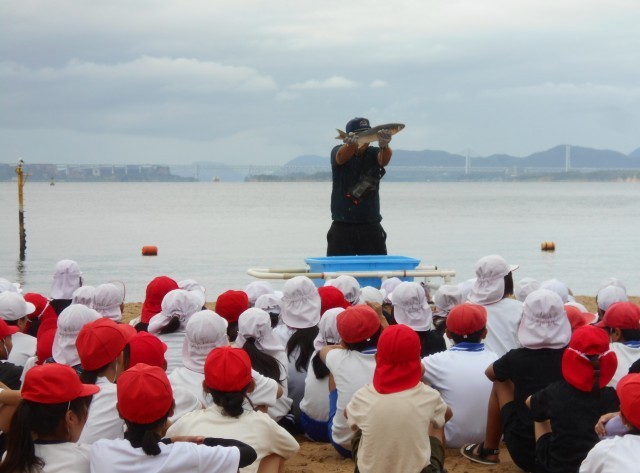 この日は、スズキなど約30匹の海の生き物を獲ることができました。参加校全員が砂浜に集まり、指導員の方から、魚やクラゲ、海草などの名前を教えてもらいました。
