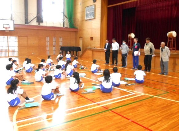 この日は、高田神社獅子練り保存会のみなさんにご来校いただき、太鼓のたたき方、笛の吹き方、獅子練りのしかたを教えてもらいました。
