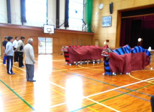 左右の移動のしかたやもとの位置へのもどり方、獅子頭の動かし方や鈴の鳴らし方など、ていねいに教えていただきました。