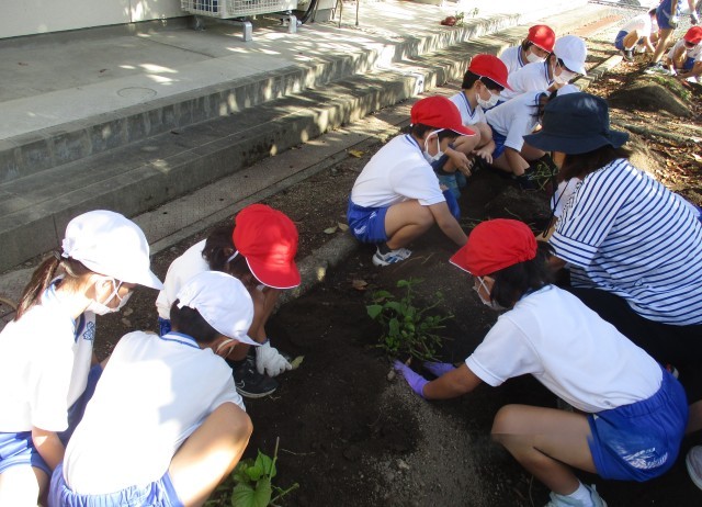 葉と茎をとってもらっていた畑に、1・2年生のこどもたちが集まり、自分たちで植えたサツマイモをほりました。
