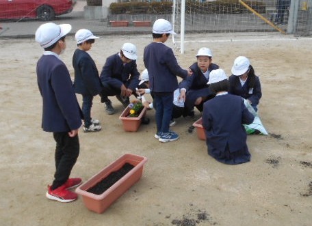 それぞれ班ごとに集まり、プランターに土を入れ、パンジーの苗やチューリップの球根を植えていきました。