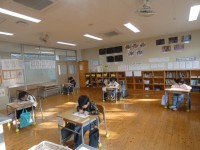 11月12日(水)☆図工の様子☆1・2年生がクレヨンを使って重ねて色を塗り、粘土べらで表面の色をこすり取り、すてきな絵を仕上げていました。カラフルなにじ、木、動物、家が浮き出ていました。3・4年生は、...