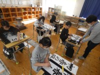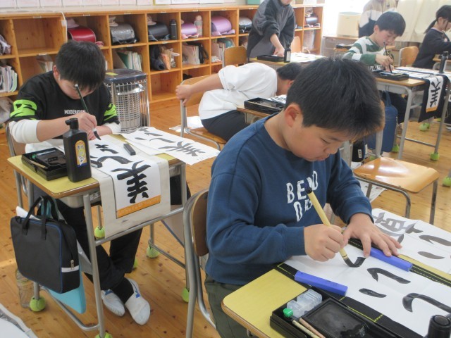 1月8日(木)☆書き初め仕上げ☆5年生が集中して書き初め「美しい朝」に取り組んでいました。写真を撮っていると、「どっちがいい?」と聞かれました。「ぼくはどう思う?」と問い返すと「漢字とひらがなのバラン...