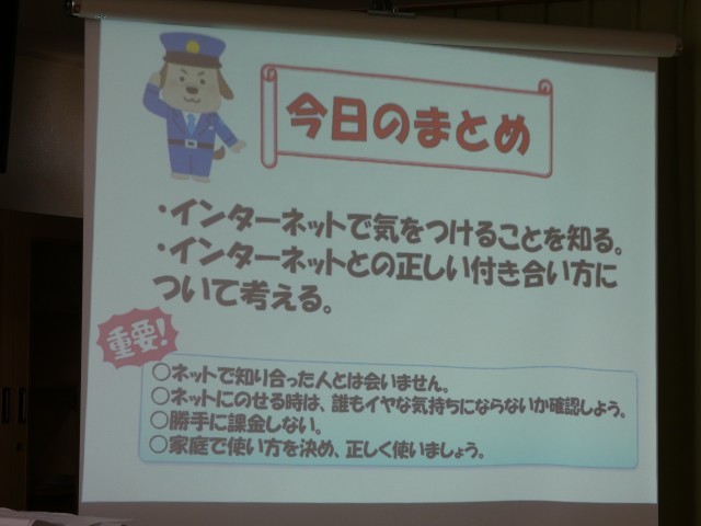 高学年は、ネット使用のルール(時間と場所)を守ること、被害者にも加害者にもならないために使い方に気を付けることを学びました。