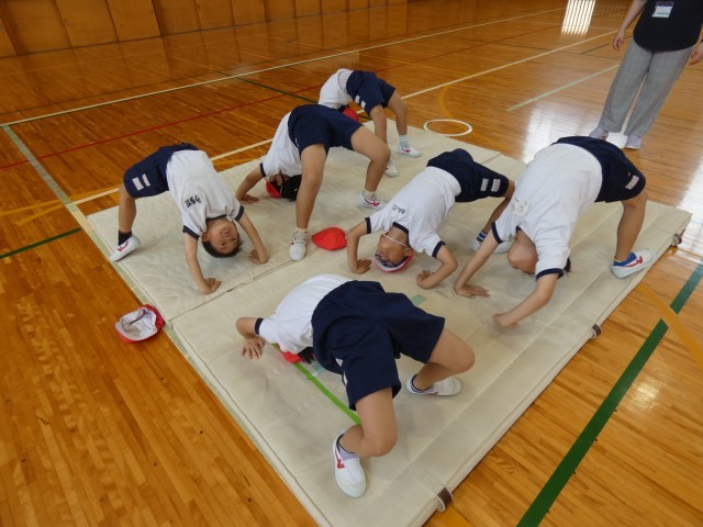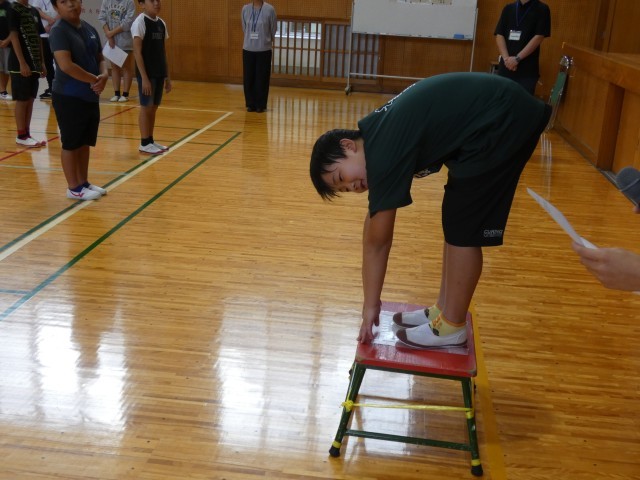 台の上にのって、できるだけ手を床につけるようにします。練習すればするほど記録がアップします。積極的に取り組んでほしいと思います。