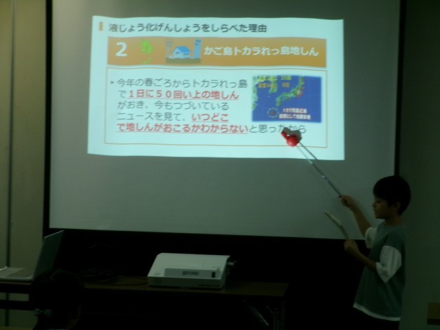 「液状化現象について」パワーポイントに分かりやすくまとめていました。多くの参加者の中での発表はドキドキしたと思いますが、練習を生かして大変立派な発表ができました。お昼の放送で全校に紹介し、みんなで拍手をおくりました!