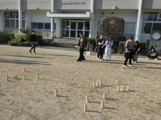 運動では親子ペアでモルック対決をしました。歓声があがっていました。