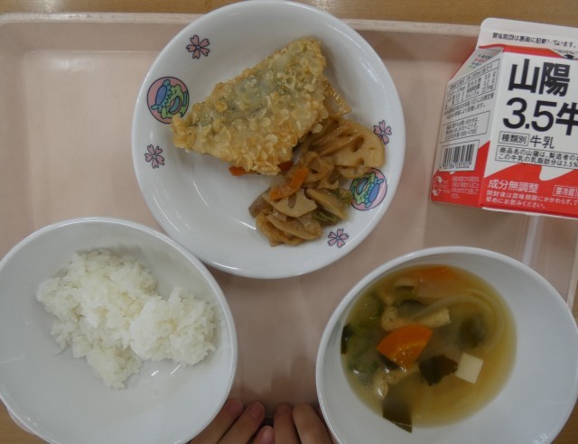 今日のメニューは「ご飯、あじ米粉玄米フライ、五目きんぴら、とうふのみそ汁、牛乳」でした。