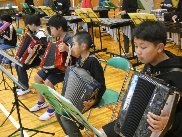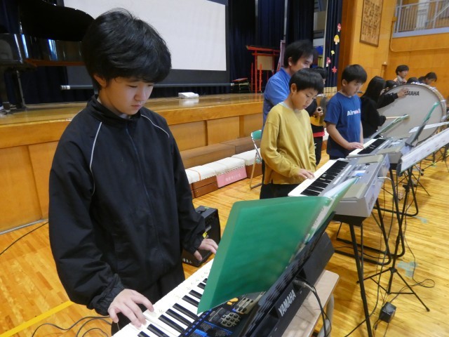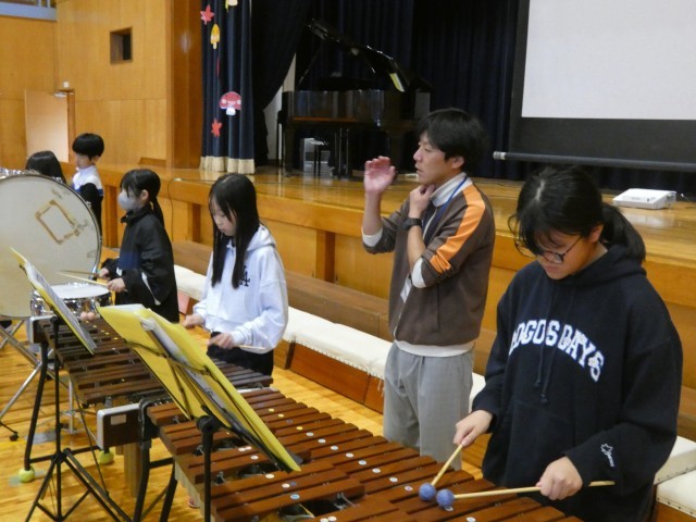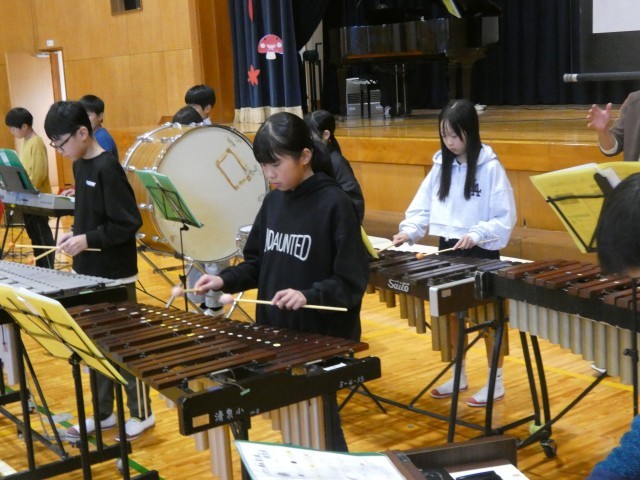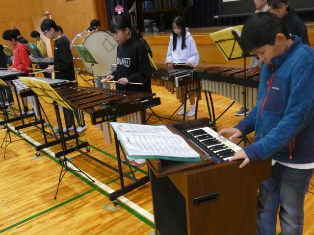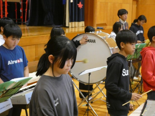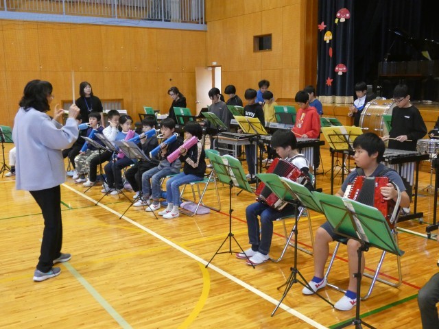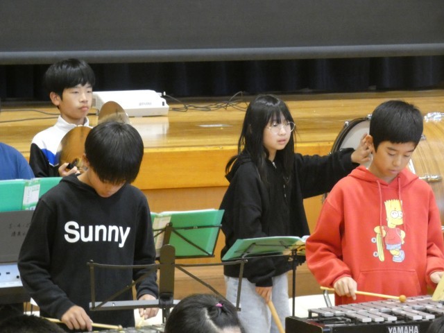 「指揮者を見る」「パートごとに終わると一回区切りをつける」「出だしの音を合わせる」ことに気を付けて練習を繰り返しました。自分の楽器で、不安な所は友達と教え合いをする姿がみられました。苦手な楽器でもあきらめずに練習をする姿が見られました。