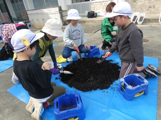 一人一鉢のあさがおのプランターと大きなプランターに協力して丁寧に植えました。