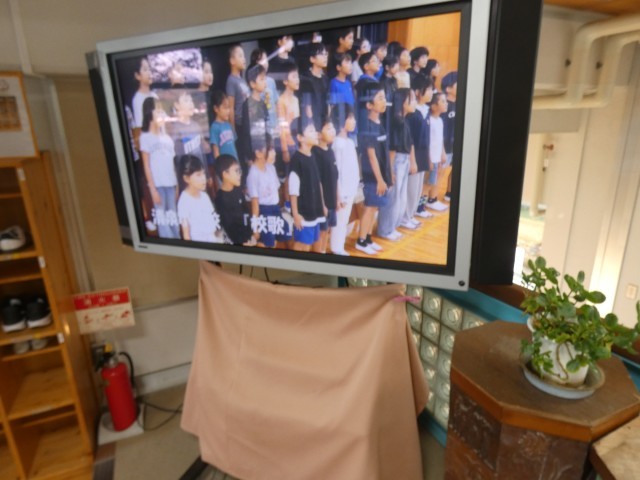 児童玄関には、今までの児童の様子をスライドショーにまとめて、大型テレビで放映しております。