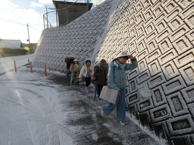 通学路には積雪があり、寒い中、足元に気を付けながら登校してきた子どもたちです。