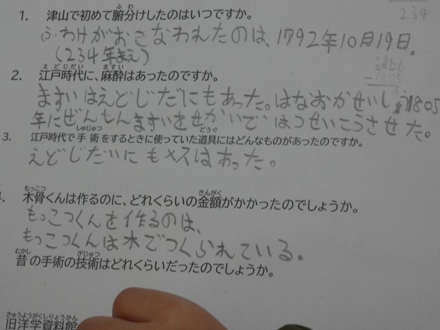 「江戸時代に麻酔はあったのですか」「手術するときに使っていた道具はどんなものがあったのですか」「薬の材料は何が使われていますか」等の質問に、展示物を示しながら、わかりやすく答えてくださいました。