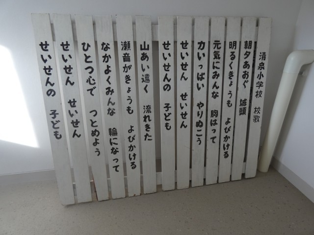 屋上に向かう階段に清泉小の校歌が飾ってありました。思わず写真におさめました。