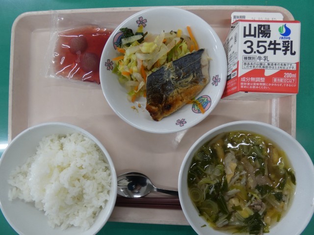 メニューは「ごはん、津山和牛のそずり汁、さわらの西京焼き、浅漬け、津山産ピオーネゼリー、牛乳」です。