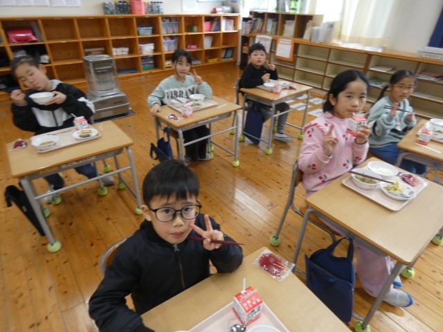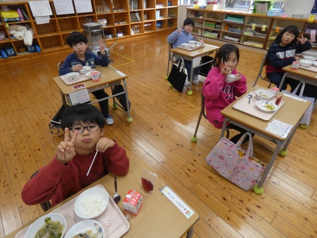 1・2年教室でカメラを向けると、すてきな笑顔とピースサインで応じ、すぐさま箸を進めていた子どもたちです。