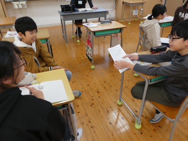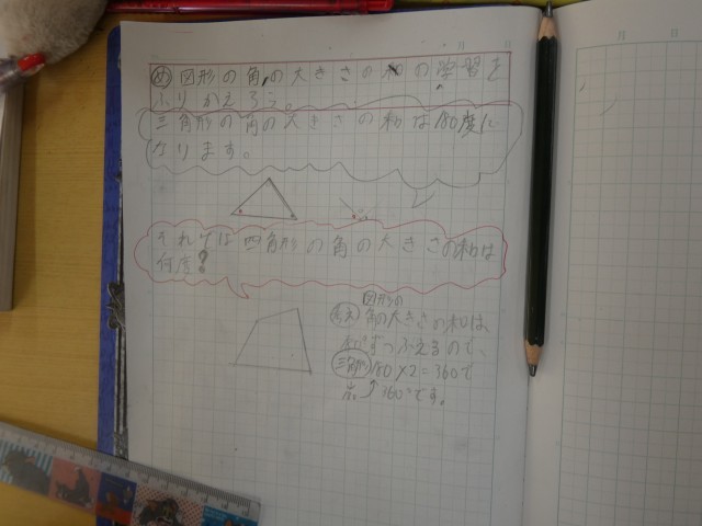 6年算数;「算数のまとめ」四角形の角度について復習をしていました。ノートがとてもていねいにまとめてあり、感心しました。6年生のみなさんの強みです!班で自分の考えを伝え合う姿もすてきでした。