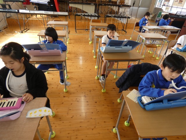 3・4年音楽;「威風堂々」のリコーダー、ピアニカの練習をしていました。卒業式に向けて練習が進んでいます。