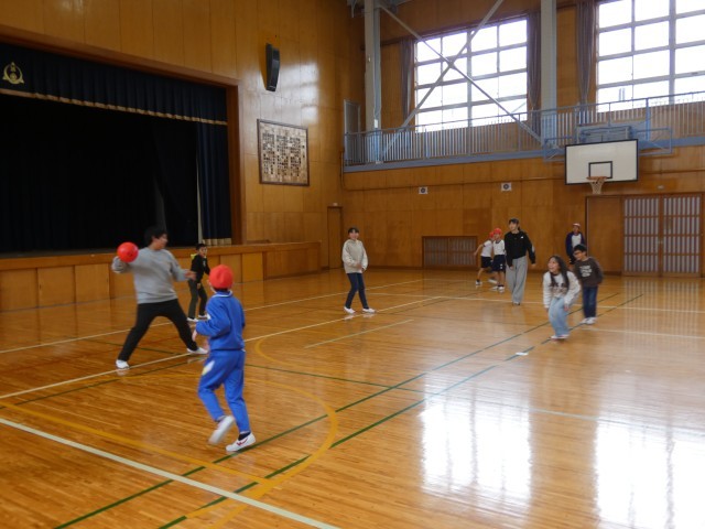 体育館では低中高学年が一緒にドッジボールを楽しんでいました。