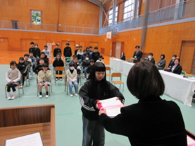 校長先生から、各学年の全課程を修了した証である「修了証書」を学年代表に手渡しました。