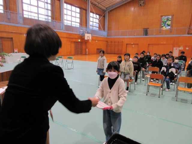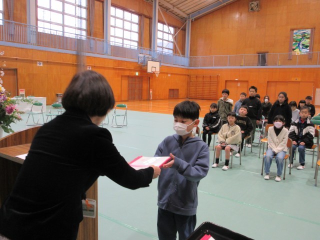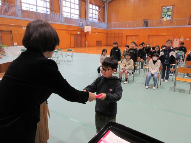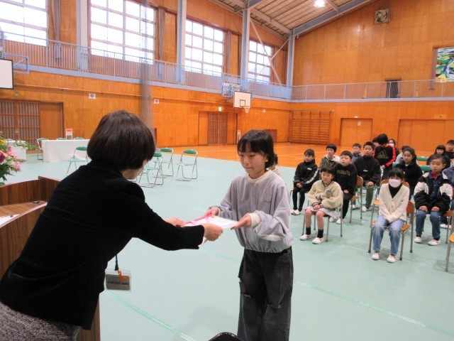 1年生;小学校生活に慣れました。先生のお話をしっかり聞いて、勉強をがんばりました。4月からは新しい1年生のお手本になってください。