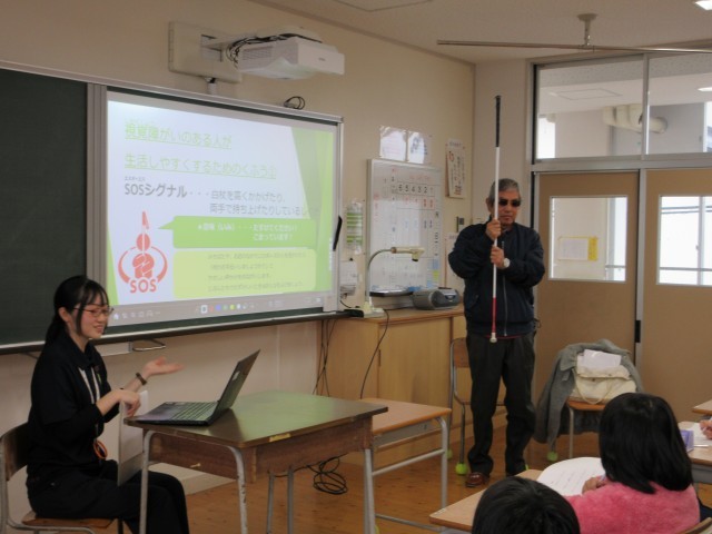 12月2日(火)☆福祉体験教室☆弱視で生活されている山本様と津山市社会福祉協議会の岡崎様をお迎えして福祉体験学習を行いました。まず、視覚障害のことや生活しやすくする工夫、バリアフリーやユニバーサルデザ...