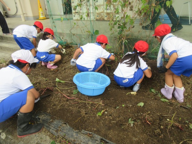 本日、1年生は農業支援者の方に教えていただきながら芋ほりをしました。夏の強い日差しを浴びて大きく育ったサツマイモを苦労しながら楽しくほりました。たくさんの収穫がありました。