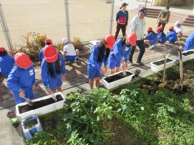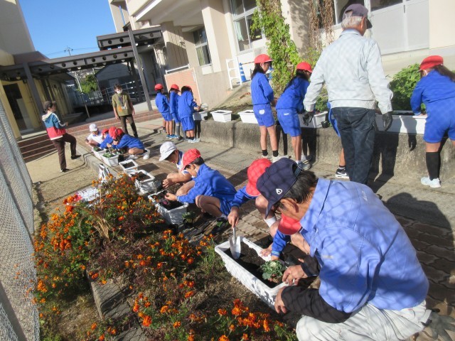 今日、1年生と3年生は農業体験指導者の方々にお世話になり、玉ねぎや葉ボタンを植えました。葉ボタンは地域の施設へプレゼントする予定です。大切に育てていきます。