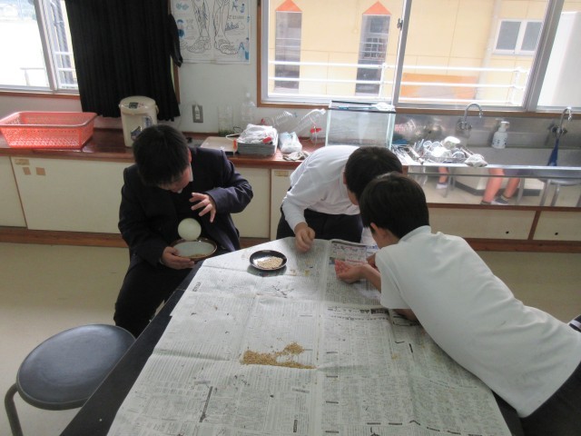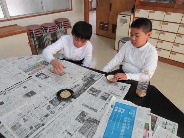 5年生が収穫したバケツ稲のもみすりを今日行いました。すり鉢を使って手作業で行いました。大変さも感じながら、玄米になるうれしさも感じている様子でした。これから精米して、実習に使うことにしています。