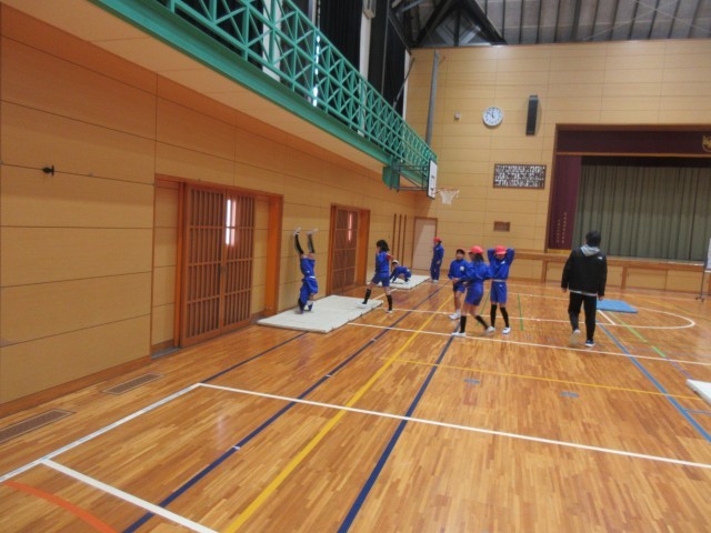 3,4年生は体育の時間にマット運動をしました。側転や倒立、開脚前転など、いろいろな技に挑戦していました。