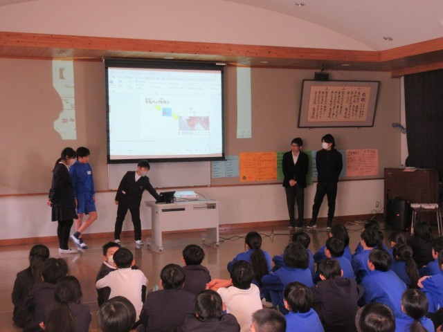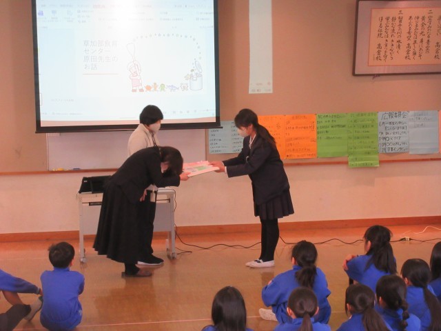 1月24日~1月30日は全国学校給食週間です。これに合わせて今日、健康委員会の皆さんが計画した給食集会が行われました。クイズやゲームなど楽しく活動ができました。終わりに、参加していただいた草加部学校食育センターのお二人に感謝の寄せ書きをお渡ししました。食について考える良い機会となりました。